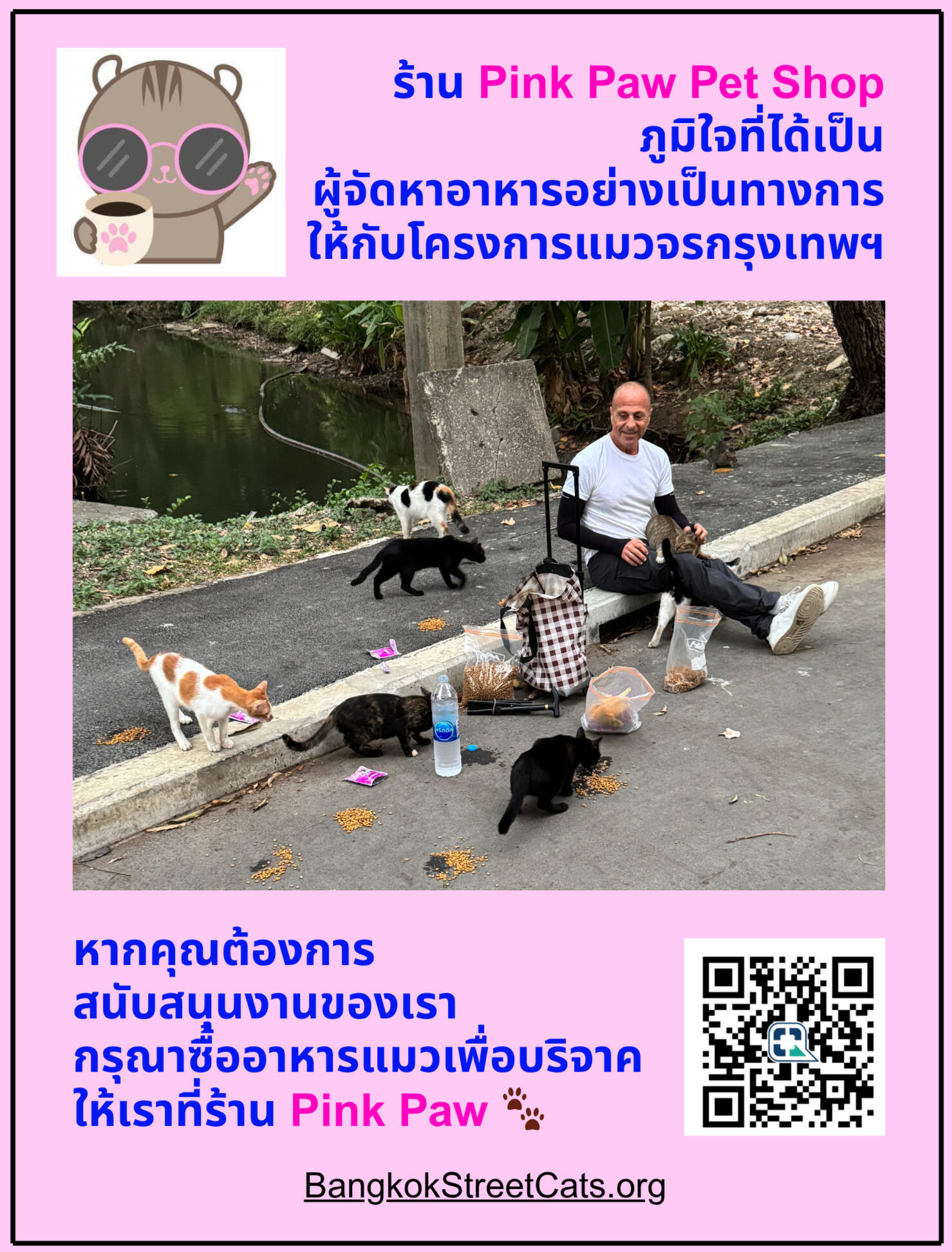 Since 2026, we have fed stray cats human-grade fresh-roasted chicken, canned chunk tuna, and kitten food pouches for finicky eaters.Our founder/executive director buys two fresh-roasted chickens at Gourmet Market (EmQuartier, Bangkok), and breaks these down for individual distribution. He also pre-opens 3 cans of premium tuna and adds water for a yummy method of hydration and nutrition. 15 pouches of Meow Meow kitten food (85g) are brought as backup.We source all the cat food from Pink Paws Pet Shop, a small Thai-owned store in the Sathorn area of Bangkok.You can support both the Bangkok Street Cat Project and a trusted local business by purchasing cat food directly from Pink Paws using the QR code below.